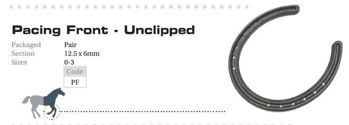 This range has new features including outside clips, blocked heels, slightly heavier sections in the front shoes, variable section widths in Pacing Hind, a true side weighted Hind, to name a few. This range which includes products such as Pacing Hind L&R, Pacing No Wing L&R, Pacing Front and Sprinter Front and Hind has now been fully revised and updated. We have developed a comprehensive range which will service the Pacing sector for the long term.