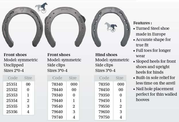 We challenge you to find better all around turned steel horseshoes with truer fit, longer wear, and greater performance in both front and hind patterns. Their full toes simply last longer, their balanced shape means less time on the anvil, they relieve pressure on the sole and the nail holes are perfect for thin walled hooves. The added benefits of the TS8 are an even thicker and slightly wider horseshoe for great support and protection of the hoof.