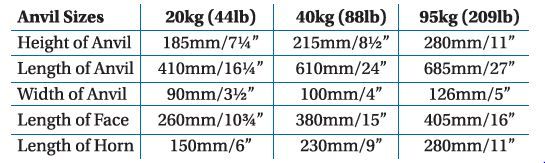 O'Dwyer anvils are available in: 20 kg (44lbs), 40 kg. (88 lbs) 95 kg (209 lbs) and the 38kg Centurion