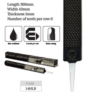 That makes this rasp suitable for softer, damper horn structures. The Black Legend differs from the Heller Legend through the addition of an extra coating that makes it more resistant to wear and rust. This rasp is suitable for many horses and particularly those that spend a lot of time outside where the hooves accumulate sand and mud that can have a negative impact on the wear process of rasps. The file side of the Heller rasps is sharp, enabling efficient removal of material with little effort.